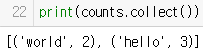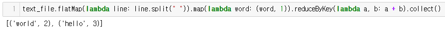 text_file.flatMap(lambda line: line.split(" ")).map(lambda word: (word, 1)).reduceByKey(lambda a, b: a + b).collect()