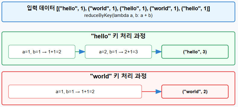 - reduceByKey(): 같은 키를 가진 값들에 리듀스 함수를 적용하여 결과를 집계한다.