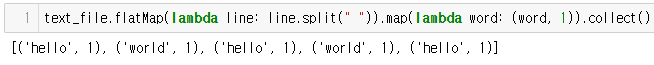 text_file.flatMap(lambda line: line.split(" ")).map(lambda word: (word, 1)).collect()