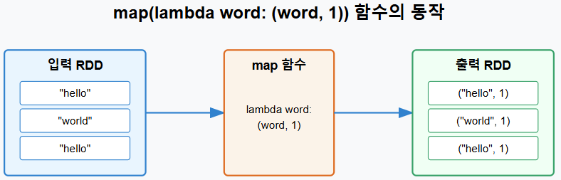 - lambda word: (word, 1): 각 단어를 (단어, 1) 형태의 튜플로 변환한다.